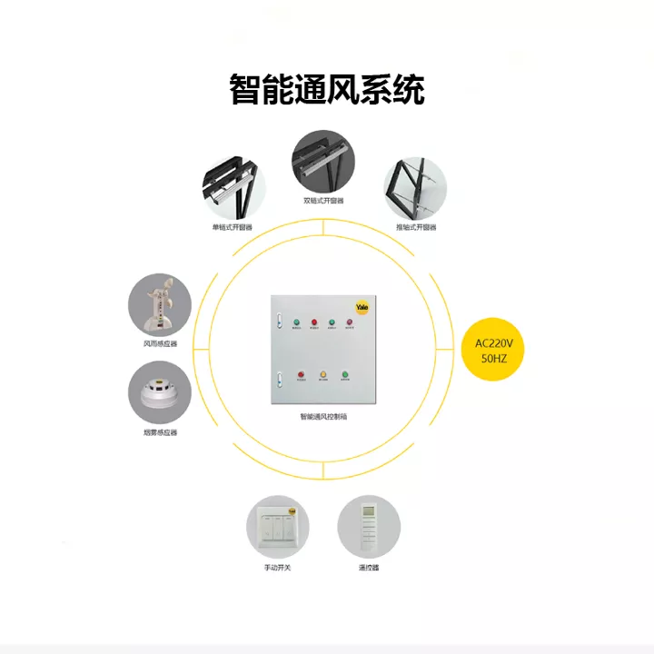 智能通风系统,由烟雾感应器、风雨感应器、通风控制箱、开窗器、手动开关、遥控控制器等组成。在风雨天气,当风速和雨量达到